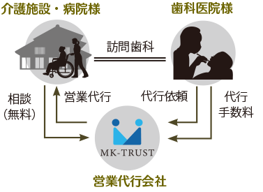 弊社は、訪問歯科医院の営業代行として、訪問歯科診療を必要とする施設様・病院様と訪問歯科医院をつないでいます。